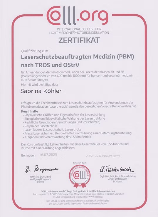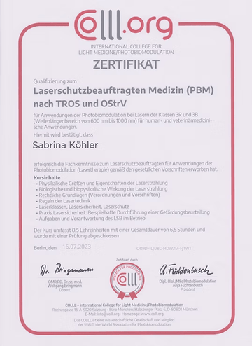- Zertifikat als Laserschutzbeauftragte Medizin